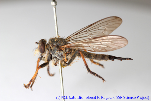 この虫の特徴 体長15㎜~20㎜程度.小型で細長いムシヒキアブである.体は暗灰色で脚の一部(脛節とふ節の先端が)黄褐色である.腹端は♂が球状で♀は長い針状の産卵管を持つ.山野に普通に見られる.